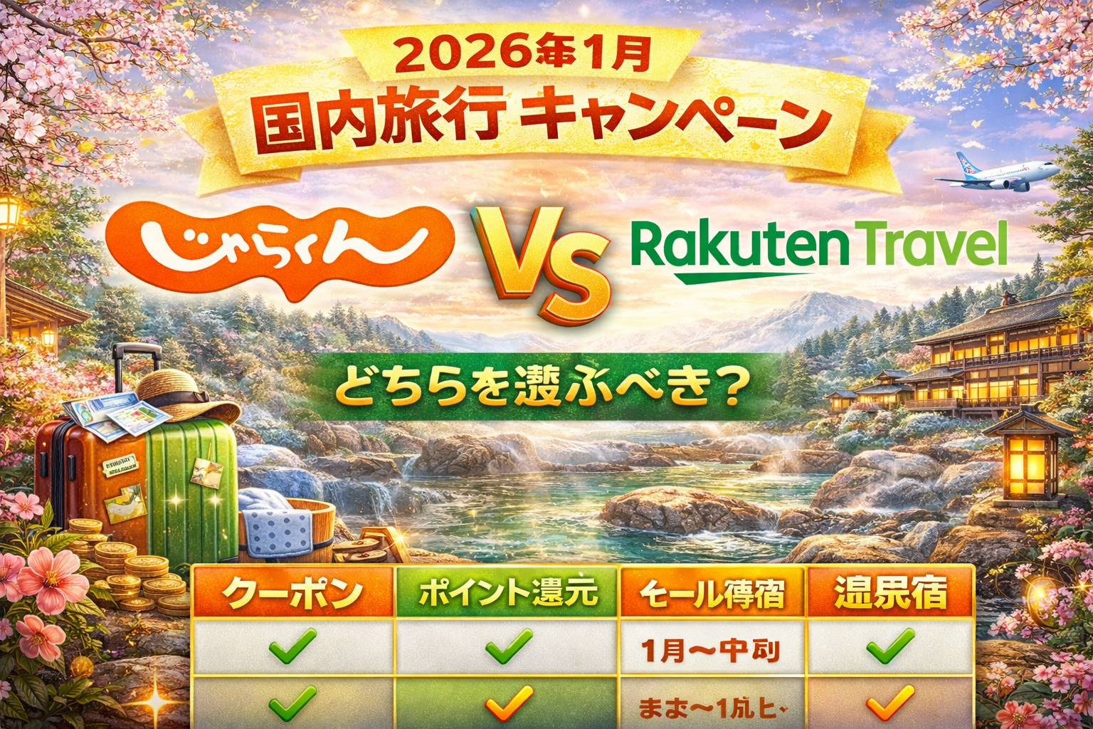 2026年1月は、じゃらんと楽天トラベルの両方で国内旅行向けのセールやキャンペーンが充実する時期です。